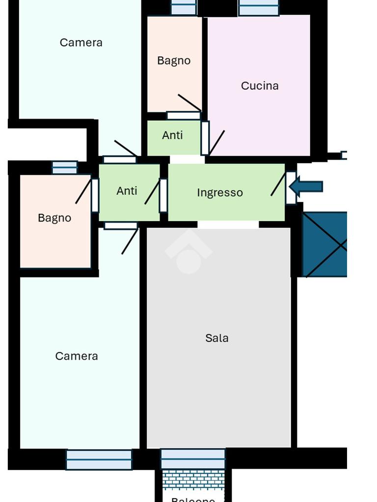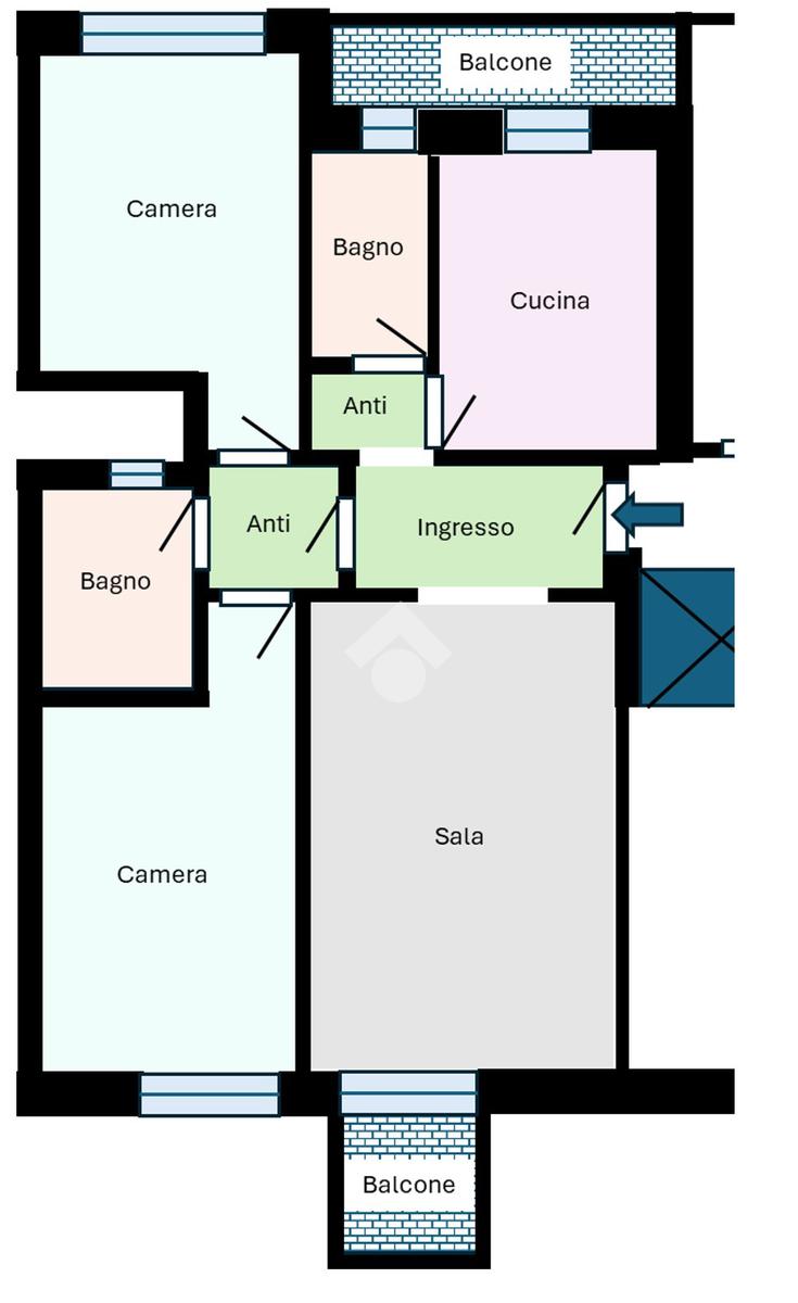 Ingresso in comodo e ampio disimpegno, sala con balcone, cucina abitabile con accesso al balcone; zona notte ben suddivisa con due camere matrimoniali e due bagni entrambi finestrati.
